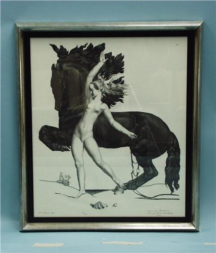 ART DECO - EUGENE ROBERT POUGHEON (1886-1955) French school. "The Riderless Horse". A coloured lithograph on white paper. Signed and dedicated. In gilt wood frame. Illustrated in A. Lesieutre: "The Spirit and Splendor of Art Deco", ill. 36. Ref. Benezit,