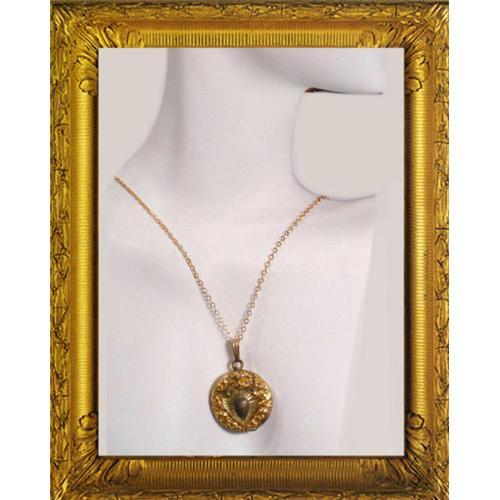 How pretty is this 20?s locket with the two old photos inside? Lovely yellow gilt shows off the heart design in the center. THe locket works great, snaps shut fine and hangs from a diamond cut gold filled 14? mint condition chain. The locket is 1 1/4? ( includes bale). What a lovely keepsake!