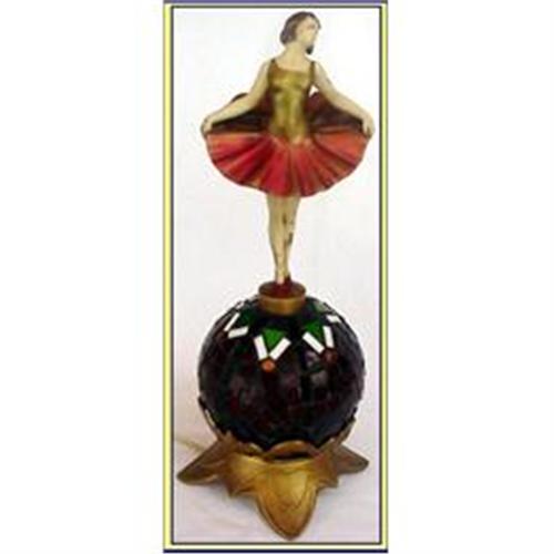 Original Art Deco lamp w iridescent metal lady dancer / ballerina standing on a glass mosaic globe and Deco openwork gold base. Made in Germany 1920-30's.<BR>12 inches high.<BR>This lamp screams Art Deco: from the 4 stylised molded leaf point base and openwork arches and points in gold metal, supporting a globe of mosaic in blue, red, green, black and white with orange 'jewels' imbedded in a ring. A wonderful ballerina / dancer - flapper pants under her iridescent tutu of metallic gold-green, copper and red. Absolutely great modelling shows every muscle in her abdoment, great detail to her curly locks and fine features. Molded straps of red ballet shoes.<BR>Engraved mark Germany with crossed lines.<BR>There is some paint loss which is natural for a piece of this age. Besides that, no damage of any sort.