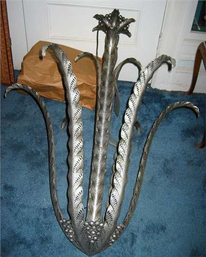 ART DECO - French wrought iron cactus form hanging lamp with grape decoration. Visible hand hammered details, with silver patina. Circa 1930. 4500-5000