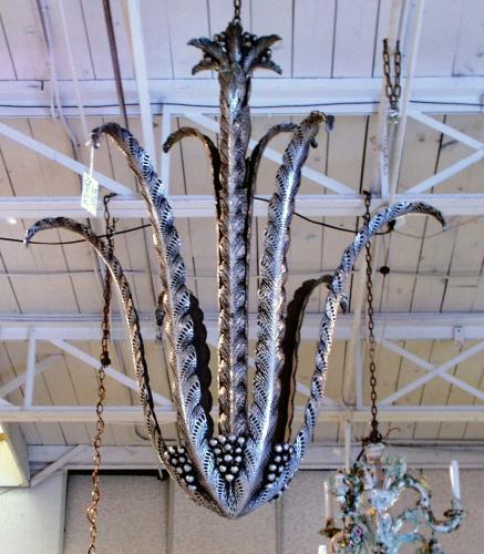 ART DECO - French wrought iron cactus form hanging lamp with grape decoration. Visible hand hammered details, with silver patina. Circa 1930.