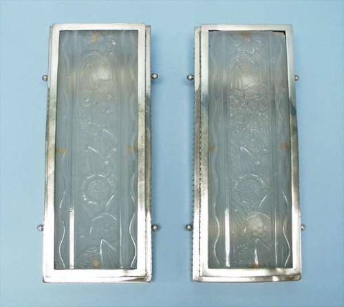 ART DECO - HETTIER & VINCENT. A pair of French chrome and frosted art glass sconces. The rectangular glass plaques relief decorated with flower set in a grooved metal frame. Signed. Each 15 1/4" x 6 1/4". Circa 1935 3000-3500