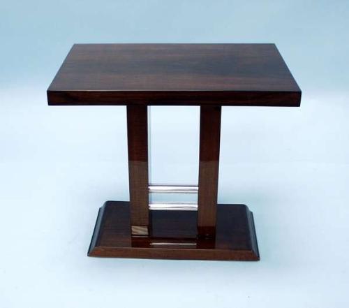 ART DECO - J. LELEU. A pair of French polished fruitwood side tables. Each rectangular top raised on columnar support with chromed metal stretcher. 22 1/2" x 14", 20" high. Recently restored. Circa 1925. 2500-3000