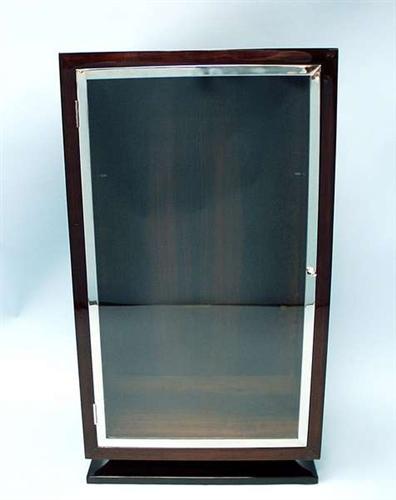 ART DECO - JULES LELEU. A fine pair of French rosewood vitrines. Each of rectangular form, raised on a pedestal support. Glazed front door with chromed metal frame. Each 20 3/4" wide, 14 1/4" deep and 37" high. French, circa 1935. 10000-14000