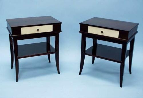 ART DECO - JULES LELEU. A pair of very good French macassar ebony lamp tables. Rectangular top, apron with parchment covered drawer. Raised on tapered legs with full shelf stretcher. 17 3/4" wide, 12 1/2" deep and 20 1/2" high. Circa 1935. 6000-7000