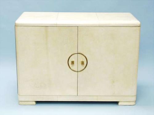 ART DECO - JULES LELEU. An important French parchment covered wooden commode. Maroon painted interior with two shelves. Rectangular front with two doors mounted with gilt bronze decorative hardware. 43" wide, 18 1/2" deep, 31" high. Circa 1935. 13000-15000