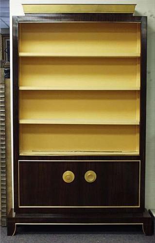 ART DECO - JULES LELEU. An important pair of French vitrine cabinets. Each closed pedestal base supports a vitrine with glass sliding doors and three wooden shelves. Interior lined with beige suede. Lower section enclosed with a pair of doors, elaborate twist locking mechanism and brass hardware. Top mounted with gilt metal fitting. 48" wide, 11 3/4" deep and 77" high. 50000-60000
