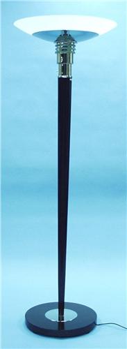 ART DECO - Jean Perzel. An attractive French macassar wood and chromed metal floor lamp. The tapered base is mounted with a metal band holding a saucer shaped frosted art glass shade. Shade 24" dia, 78" high.