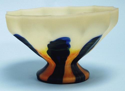 ART DECO - KRALIK. A decorative Austrian art glass bowl. The faceted opaline glass ground is decorated with fused blue and orange panels. Top 9 1/2".