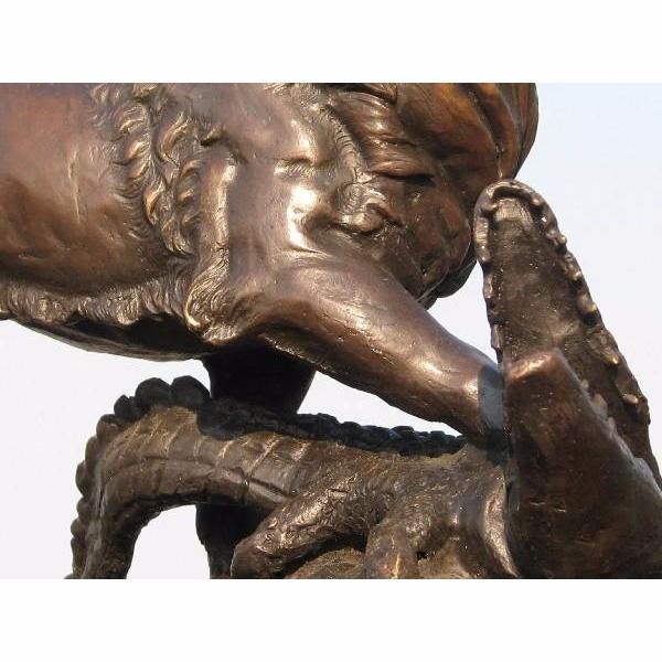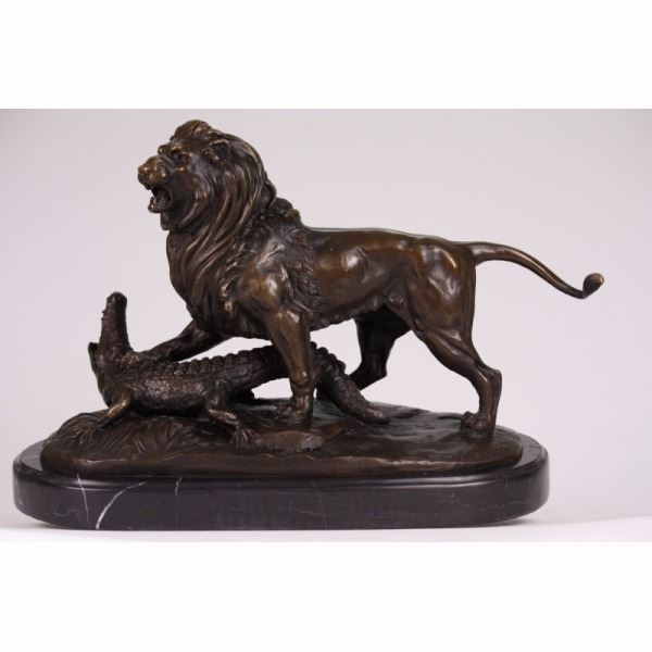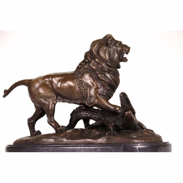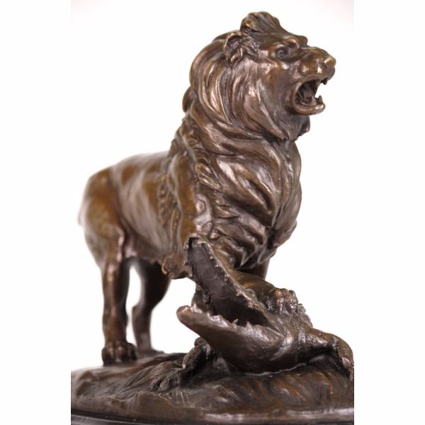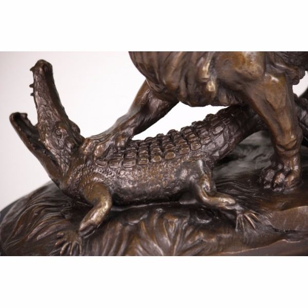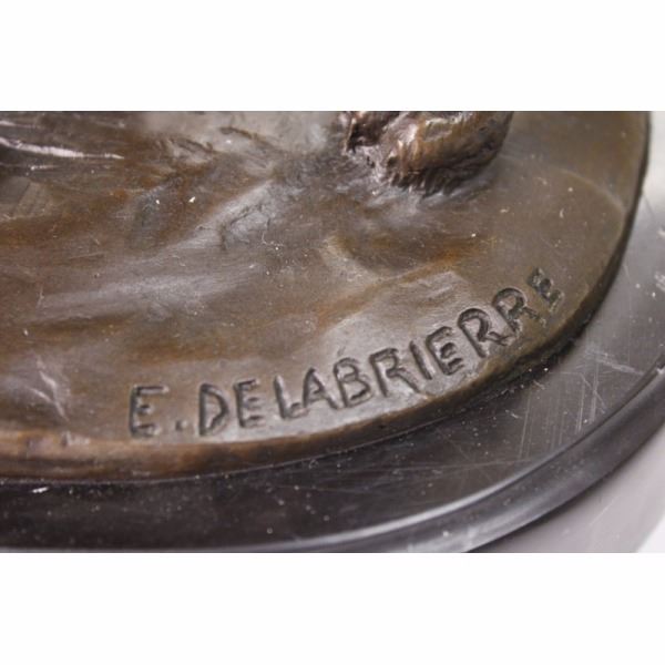 Almost nothing is known of Delabrierre's life besides his works. He devoted his entire prolific career to animal sculpture. Born in Paris on March 29, 1829, he died there in 1912. He studied painting under Delestre but at a very early stage in his career he concentrated on animal sculpture and made his debut at the Salon of 1848 with Terrier holding a Hare and Wounded Deer. Delabrierre exhibited regularly at the Salon until 1882 and covered a wide range of animal studies, from racehorses and hunting dogs to game birds and exotic zoological specimens. His lions, tigers, antelopes, camels and bears were imbued with a spirit of realism and characterization, which was outstanding in the Animalier school. The theme of a Lion attacking a Crocodile was a popular subject and most artists of this time produced several in their careers. This is a good example of Delabrierre's work and is viewable from any angle. It is finished in a rich red brown patina. Condition: This sculpture is in a very good condition. Bronze Dimensions with Marble Base:Height 10" x Width 16"Marble Dimensions: 14" X 7 ".Height without base: 9 " Weight : 20 LBSInventory : 7490K15647 Almost nothing is known of Delabrierre's life besides his works. He devoted his entire prolific career to animal sculpture. Born in Paris on March 29, 1829, he died there in 1912. He studied painting under Delestre but at a very early stage in his career he concentrated on animal sculpture and made his debut at the Salon of 1848 with Terrier ho