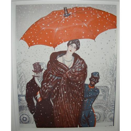 This is an exquisite original Art Deco magazine illustration from ?La Vie Parisienne? dated February 1922. This drawing is of a Society Woman arriving to the event wrapped in mink with matching turban. She walks clutching her purse and holding her mink closely as she walks through a snow filled sky. Her escort is in coat and top hat while the black porter holds an umbrella to protect her from the falling snow. It is framed with a double matted shadowed mahogany frame. The frame may be hung or set on a table. There is also another illustration of a Lady Walking a Whippet Dog with identical frame. Frames measure 12-3/4? X 14-1/2? X 1-3/4?.