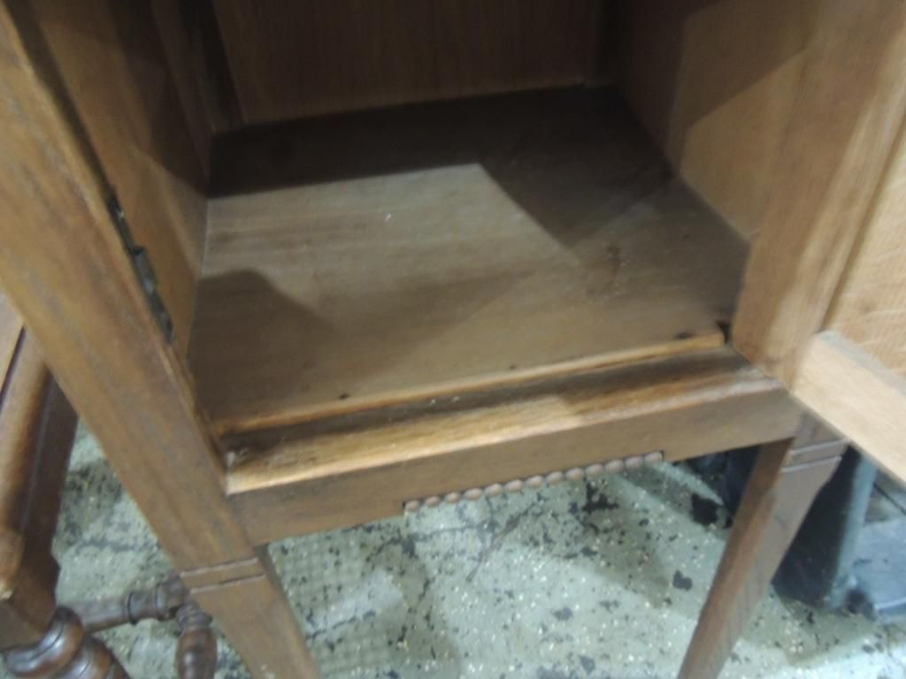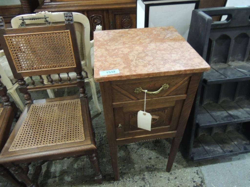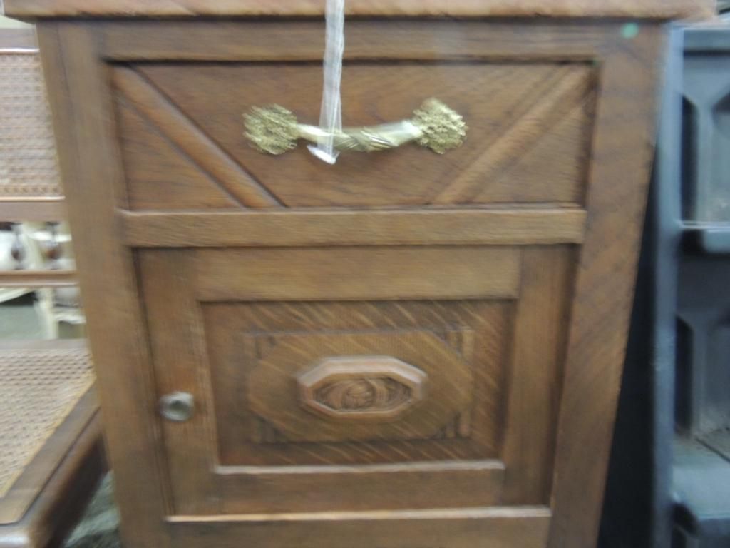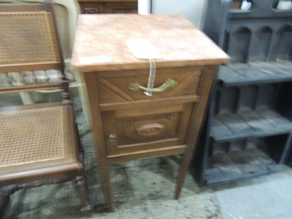 ART DECO MARBLE TOP END TABLE WITH DRAWER AND STORAGE. CARVED WOOD DETAIL. AS SHOWN SEE PHOTO FOR MORE DETAILS