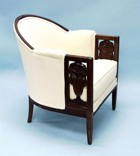 ART DECO - PAUL FOLLOT. A pair of fine French walnut armchairs. Each with arched top rail above a curved padded back and seat. Sides inset with pierce wood panels carved with baskets of flowers. Raised on reeded tapering legs. Recently reupholstered in beige velvet. Circa 1915. 8000-10000