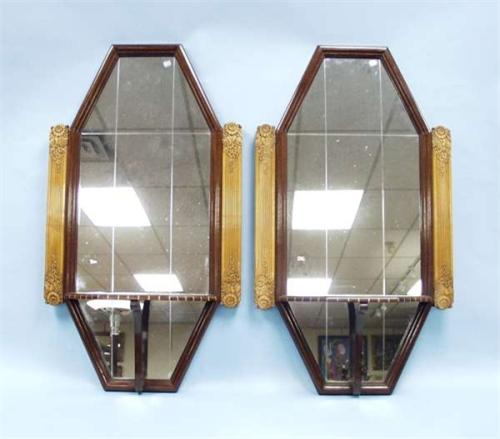 ART DECO - PAUL FOLLOT. An unusual pair of French mahogany and satinwood framed wall mirrors. The octagonal frames are relief carved with floral motifs and mounted with inlaid wall brackets. 34" x 19" 7000-8000