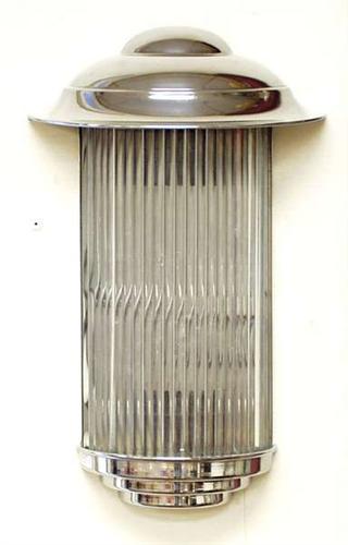 ART DECO - PETITOT. An unusual pair of chromed metal and glass wall sconces. The 'D' shaped fixture is formed by elongated glass columns with metal pagoda style cover. 20" high. Circa 1935. 1800-2500
