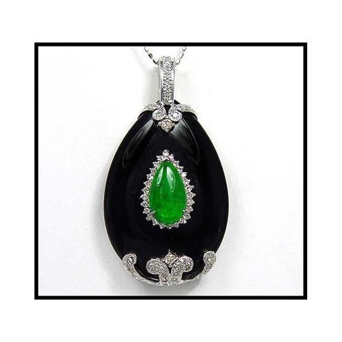 Natural, untreated, imperial color precious jade has good translucency. It is set with 31 sparkling white diamonds for perfect contrast against the polished onyx. The 14K solid white gold (9.2 grams) pendant is the work of a master goldsmith, and his skill shows in the fine 1930s Art Deco style detailing. It measures 39mm (117/32") long including the bale. The chain is not included. It was fairly priced for $1400, but may be yours for well less than half of that amount.