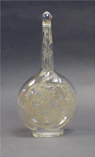 ART DECO - R. LALIQUE "Aubepines". A clear art glass decanter with frosted floral decoration and enamel highlights. Signed. 12 1/2" high. Ref: Marchilac: R. Lalique Catalogue Raisonne, page 738 #3157. An early and rare model, created in 1914 and discontinued in 1947.