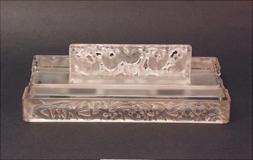 ART DECO - R. LALIQUE. Encrier "Mirabeau." A clear and frosted crystal inkwell. Rectangular stand, cover moulded with a design of frosted birds amidst fruit covered branches. Signed. 10 1/2" long. Reference: Marcilhac, page 319, #440. A 1927 model, discontinued after 1947.
