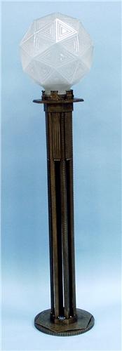 ART DECO -R. LALIQUE -"Nanking". A very good wrought iron floor lamp fitted with a large frosted glass globular shade with geometric designs. Signed. 58 " high. French, circa 1935. Shade illustrated in Felix Marcilhac, Catalogue Raisonne, model # 2463, discontinued after 1947.