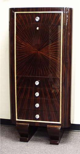 ART DECO - RENE DROUET. An important French macassar ebony drop front secretary. Rectangular front parquetry inlaid in a sunburst pattern. Drop front door with silver embossed beige leather writing surface, interior with a satinwood cupboard fitted with drawers and open shelves. Crystal ball handles. 28 1/2" wide, 16" deep and 59" high. Recently restored. Circa 1935. 25000-35000