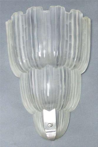 ART DECO - SABINO. A good pair of French frosted art glass wall sconces. The torch shaped glass fixtures mounted on metal supports. 8" wide, 3 3/4" deep, 11" high. Circa 1935. 3000-3500