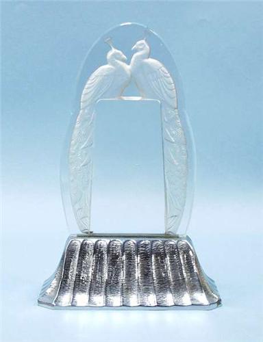 ART DECO - SABINO, Paris. An unusual clear and frosted glass plaque intaglio carved with a pair of peacocks. Signed. Raised on chromed metal pyramidal base, with electric lighting. 9 1/2" high. 2500-3000
