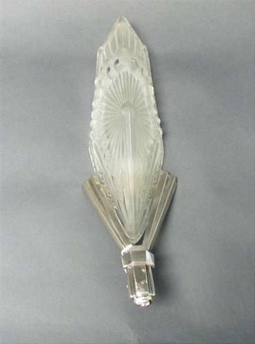 ART DECO - SCHNEIDER, FRANCE. An unusual pair of frosted art glass wall sconces. The silver patinated bronze base with flame shaped glass inserts. The relief is decorated with geometrical motifs. 16" long. Signed in relief. Circa 1935. 2500-3000
