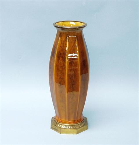 ART DECO - SEVRES. A fine French porcelain vase with gilt metal base. The facetted vessel with fire polished amber glaze. Raised on gilt metal base. Signed underside. 17" high. Circa 1925.