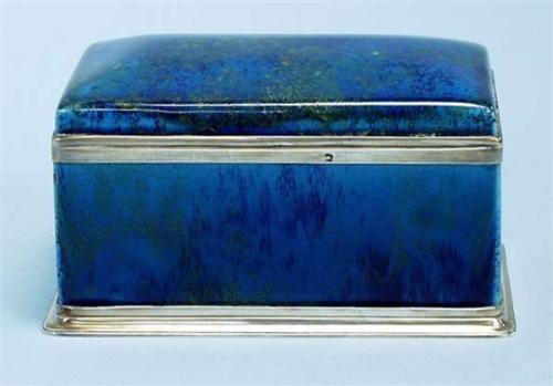 ART DECO - SEVRES, FRANCE. A fine flambe glazed faience jewellery box with silver base and frame. The rectangular box is decorated in blue, green and yellow. 6" x 4"x 3 1/2". Both silver and faience are fully marked. 1300-1500