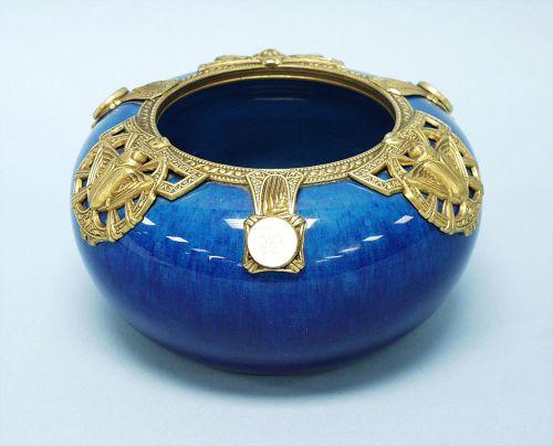 ART DECO - SEVRES, FRANCE. An unusual gilt bronze mounted porcelain bowl. The fire glazed blue vessel mounted with gilt bronze stylized bugs and carved mother-of-pearl insets. Hallmarked underside. 7" dia. Circa 1935.