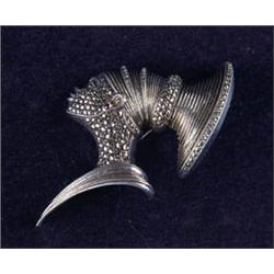 Lot 154 ART DECO SILVER AND MARCASITE PIN Left facing profile shoulder bust of a woman with a large fancy hat. Her face and neck covered with marcasites and she wears a red stone earring. Marked “935”. SIZE: 2-3/4” h x 1-1/2” w. CONDITION: Very good. 5-70671