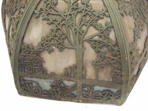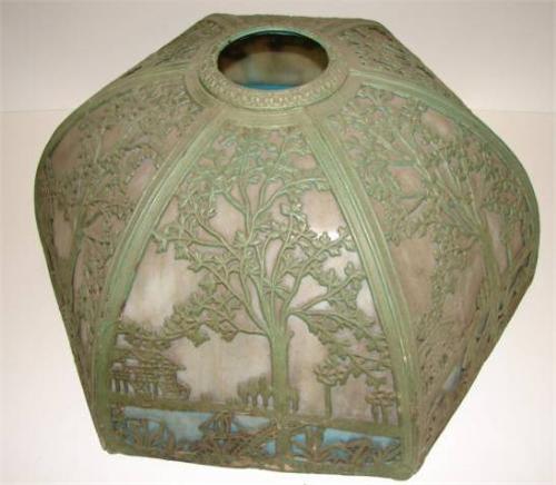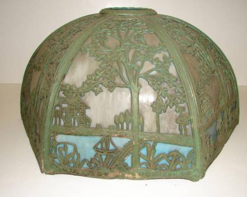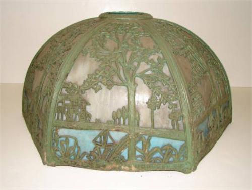 ART DECO SLAG GLASS LAMP SHADE. 6 panels. Has metalware frame decorated with scene of house with tree along water. Decorated with 6 cream slag glass panels and 6 blue slag glass panels. 20.5" Dia.