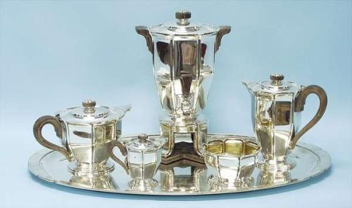 ART DECO - TETARD FRERES, Paris. A very good 7 piece sterling silver tea service comprising a large tray, a samovar, a coffee, tea and hot water pots, a sugar basin with vermeil interior and a creamer. Each piece fully marked. Cca. 1935. Appx. weight: 278 ozs. 16000-18000