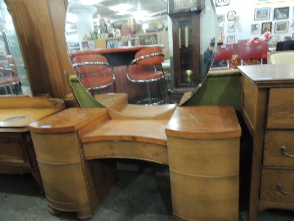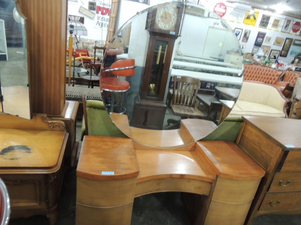 ART DECO VINTAGE VANITY WITH LARGE MIRROR. BEAUTIFUL LARGE CIRCLE MIRROR. AS SHOWN SEE PHOTO FOR MORE DETAILS.