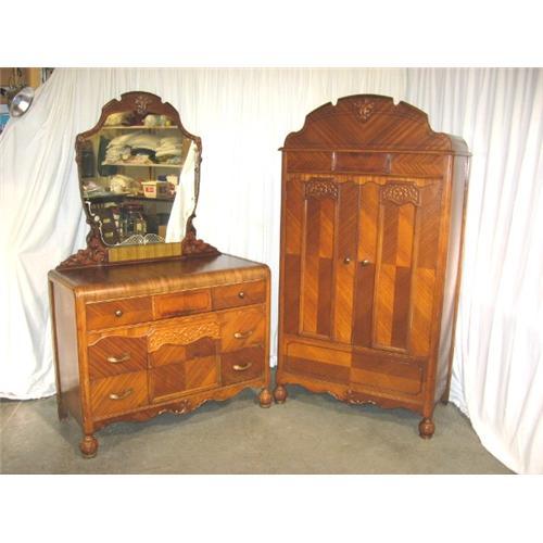 This beautiful set includes a Art Deco waterfall wardrobe and matching dresser. Both pieces feature gorgeous veneers, dovetailed construction, and great carving details. There is very nice brass hardware, and both pieces have ball feet in the front. The wardrobe has some cedar lining inside. The left side is designed for hanging clothes, providing an area that is 50 3/4" in height, 17 3/4" from side to side, and 19" from front to back. The right side has an open shelf, which is 14 3/4" in height, 17 1/2" from side to side, and 19" from front to back. There are also two pull-out wooden drawers, that are both 5 3/4" deep, 13 5/8" from side to side, and 14 3/8" from front to back. Below this is a nice size open storage area, measuring 19 1/2" in height, 17 1/2" from side to side, and 19" from front to back. The dresser has a beautifully shaped and etched mirror. There are three full length drawers, that are all 39 1/2" from side to side, and 16 38" from front to back. The top one is 4" deep, the second and bottom drawers are 5 7/8" deep. Both pieces are in very good condition. There are just slight signs of normal use and age, and the dresser does have some damage to the veneer. We have shown this in a photograph. The dresser is 71 3/4" in height, 45 3/4" from side to side, 21 1/2" from front to back, and weighs 104 pounds. The wardrobe is 70 3/4" in height, 38 7/8" from side to side, 21" from front to back, and weighs 118 pounds. Total weight for the set is 222 pounds.