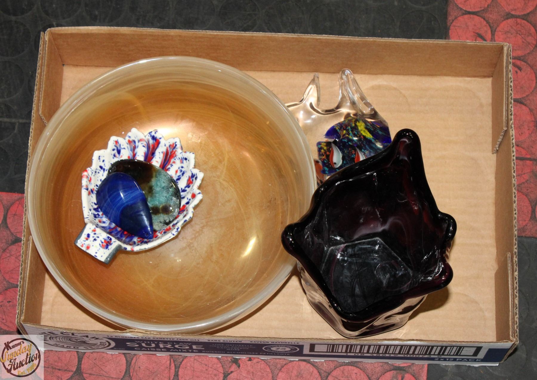GLASS BOWL + CHALET/MURANO 3 POINT GLASS VASE + 2 POLISHED GEMSTONES **ALL ITEMS MUST BE REMOVED BY 5PM SATURDAY, JUNE 14TH 2025. ALL REMAINING ITEMS WILL BE SUBJECT TO A $6.00 PER DAY STORAGE CHARGE. ANY ITEMS REMAINING AFTER MONDAY, JUNE 30TH, 2025 WILL BE CONSIDERED FORFEITED. NO REFUNDS WILL BE ISSUED FOR FORFEITED ITEMS. TO SCHEDULE A PICK UP APPOINTMENT CLICK HERE