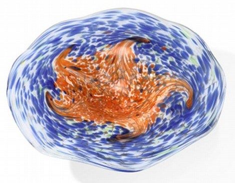 ART GLASS BOWL - UNIQUELY HAND CRAFTED - 3.5"H x 15.5" DIAMETER - BLUE & RED/ORANGE TONES