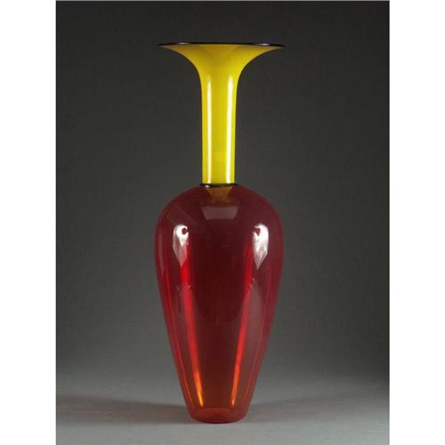 ART GLASS: Dante Marioni (Washington 1964-) Big Whopper in red and yellow with black lip, c. 1988, unsigned.