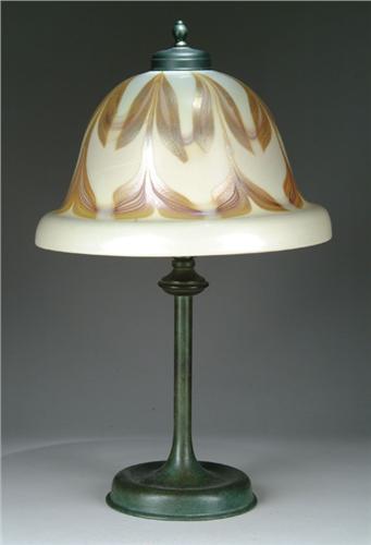 ART GLASS LAMP. Beautiful helmet shaped shade has pulled leaf design in gold and red/brown iridescence against a cream colored lightly iridescent background. Shade rests atop a period metal lamp base with nice green patina. SIZE: Shade is 12 in. dia. Overall height is 20 in. CONDITION: Very good to excellent. 5-60791