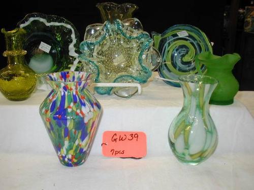 ART GLASS LOT INCLUDES SWIRL BOWL 5 3/4in, SATIN GLASS PITCHER W/GRAPE DESIGN, (2) CZECH ROYAL LIMITED VASE, 1950'S ASHTRAY EXCELLENT, GREEN CRACKLE VASE, GREEN & WHITE SWIRL 6in, 1920 6 1/2in VASE, 7 PCS