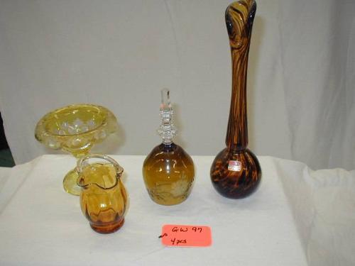 ART GLASS LOT INCLUDES VIKING TORTOISE SHELL VASE 11 1/2in, EUROPEAN CUT CRYSTAL YELLOW COMPOTE 5 in (AS IS SM. FLAKE UNDER THE RIM), CUT AMBER CRYSTAL BELL (MISSING CLAPPER), 1940'S BASKET VASE, 4 PCS