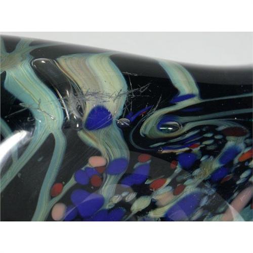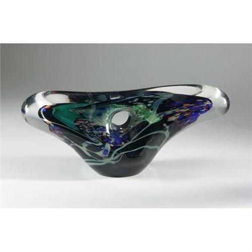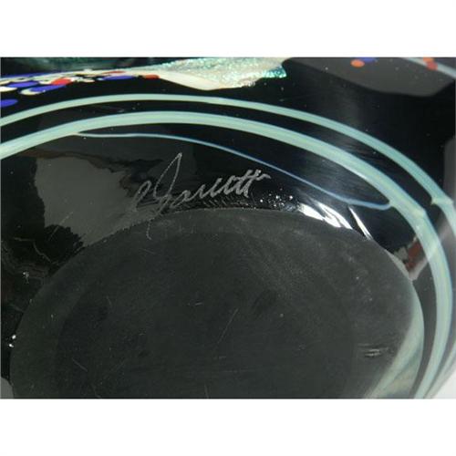 ART GLASS: Signed art glass objet d'art, thick clear glass cased over black splatter interior with iridescent foil overlay, oblong with center hole, signed ''R. Garrett'', 16'', condition noted.