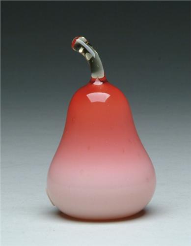 ART GLASS PEAR. Cute art glass pear is raspberry pink shading to a pale pink with applied clear crystal stem. SIZE: 4-1/4 in. t. CONDITION: Very good to excellent. 5-60264