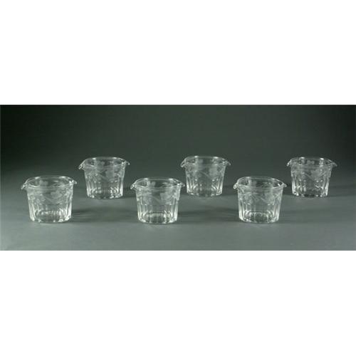 ART GLASS RARE IRISH WINE GLASS RINSERS: A lot of six round Irish matching wine rinsers, attributed to circa 1780 - 1820. The base is clear with a convex center on the base side, up the first 1 5/8'' is in panel form. From research, it would appear this is how the glasses were probably received in New York, possibly sold by the firm of DM & P Manheim. At some later time, an etched grape vine motif was added along with a fine uniform gadroon edge in leaf form was applied. 3 1/2'' h X 4 5/8'' w, excluding glass holder. The set is not only rare but in very good condition with only a few flea bite chips on the bases, no damage on the top. There are the expected scratch and wear marks commensurate with the age of these glasses.