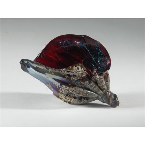 ART GLASS: Sea shell form art glass objet d'art, iridized ruby glass with polychrome splatter exterior and green foil mica flecks on interior, possibly a Friedman Glassworks Studios ''Shilshole Shell'', 7.5'' x 3''.