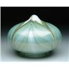 ART GLASS SHADE. Wonderful art glass shade has green pulled feather design against a creamy white background. The veins in the pulled feather are slightly raised. Pulled feather is outlined with a beautiful gold iridescent band. SIZE: 7 in. dia x 5 in. t x 4 in. fitter. CONDITION: Very good to excellent. 5-61061
