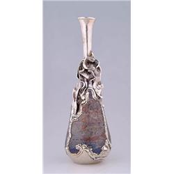 Lot 61 ART GLASS & SILVER VASE Extremely unique hand blown vase has blue, red and gray, slightly iridescent glass blown with a controlled bubble which gives the surface the look of multicolored pebbles. Face is overlaid at foot and from shoulder up through neck with high relief silver designs of flowers, leaves and flowing lines. We are unsure of the age of this vase, but it is undoubtedly a high quality piece of work. SIZE: 8” t. CONDITION: Some open bubbles from manufacture, otherwise very good to excellent. 5-71032
