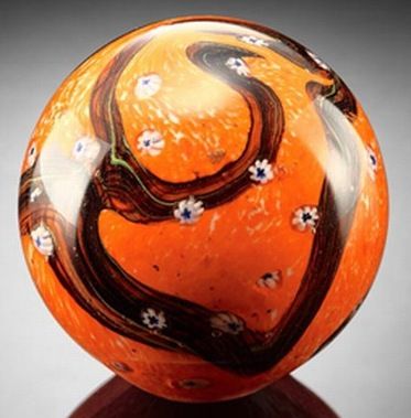 ORANGE SWIRL WITH LITTLE DAISIES - ART GLASS SPHERE / PAPERWEIGHT - HAND CRAFTED - 4.5" DIAMETER