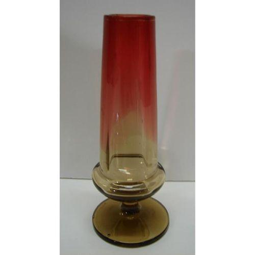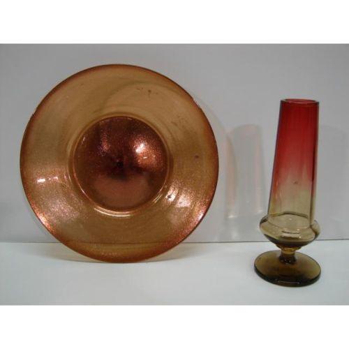 ART GLASS VASE AND PLATE. Consists of an copper metallic art glass plate (7” Dia.) and an amberina art glass vase (5.75” H).
