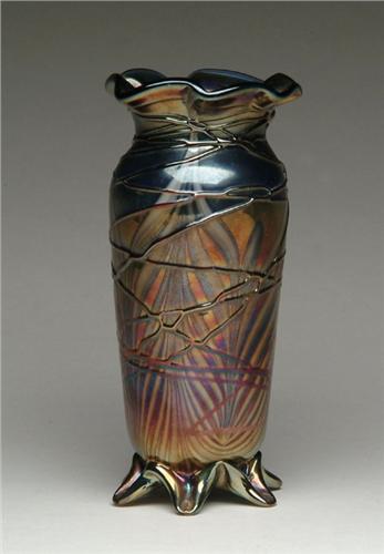 ART GLASS VASE. Wonderful art glass vase has pulled feather design against a dark blue iridescent background with bronze iridescent threading surrounding the vase. Vase rests upon a gold iridescent applied foot. SIZE: 7 in. t. CONDITION: Very good to excellent. Collection of Dr. C. and Margaret Chastain 5-61455